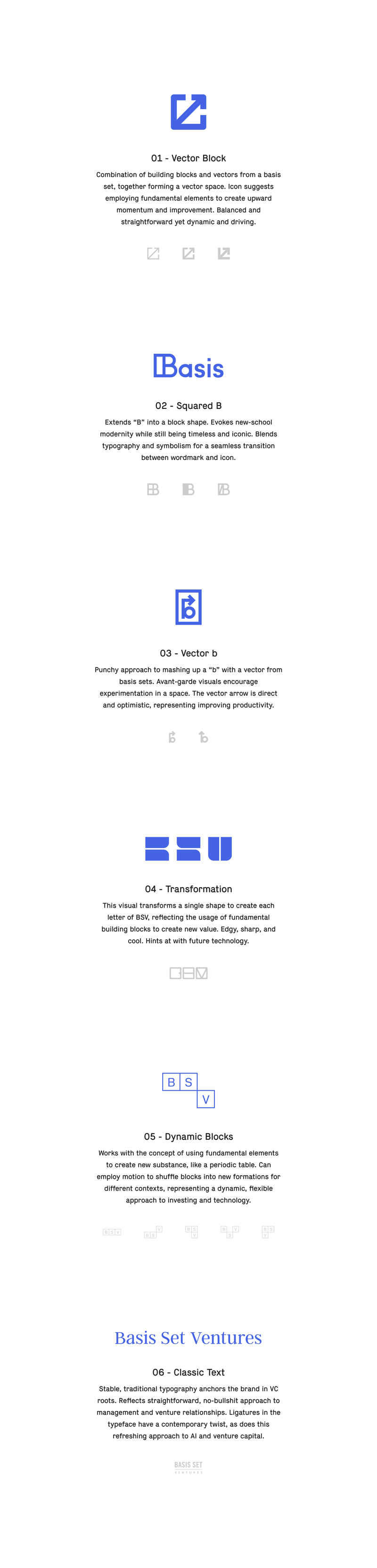 Basis Set Ventures July 2017 I worked with Lan Xuezhao and Kurt Varner on branding BSV’s $136M AI-focused venture capital fund. The final logo combines vector and building block imagery, reflecting mathematical concepts behind the namesake. Website↗ Explorations
